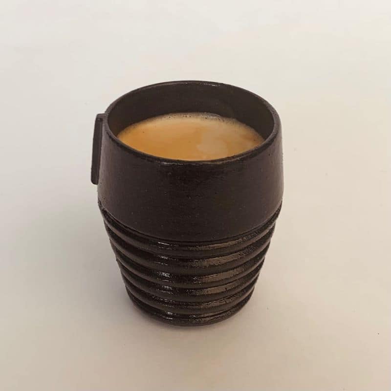 La tasse Sillage invite à laisser glisser les doigts sur les stries, à sentir la texture chaude et vivante de la terre. La partie haute lisse rend chaque gorgée douce et agréable, tandis que la barrette verticale apporte un contraste graphique, un détail subtil qui rythme le geste.